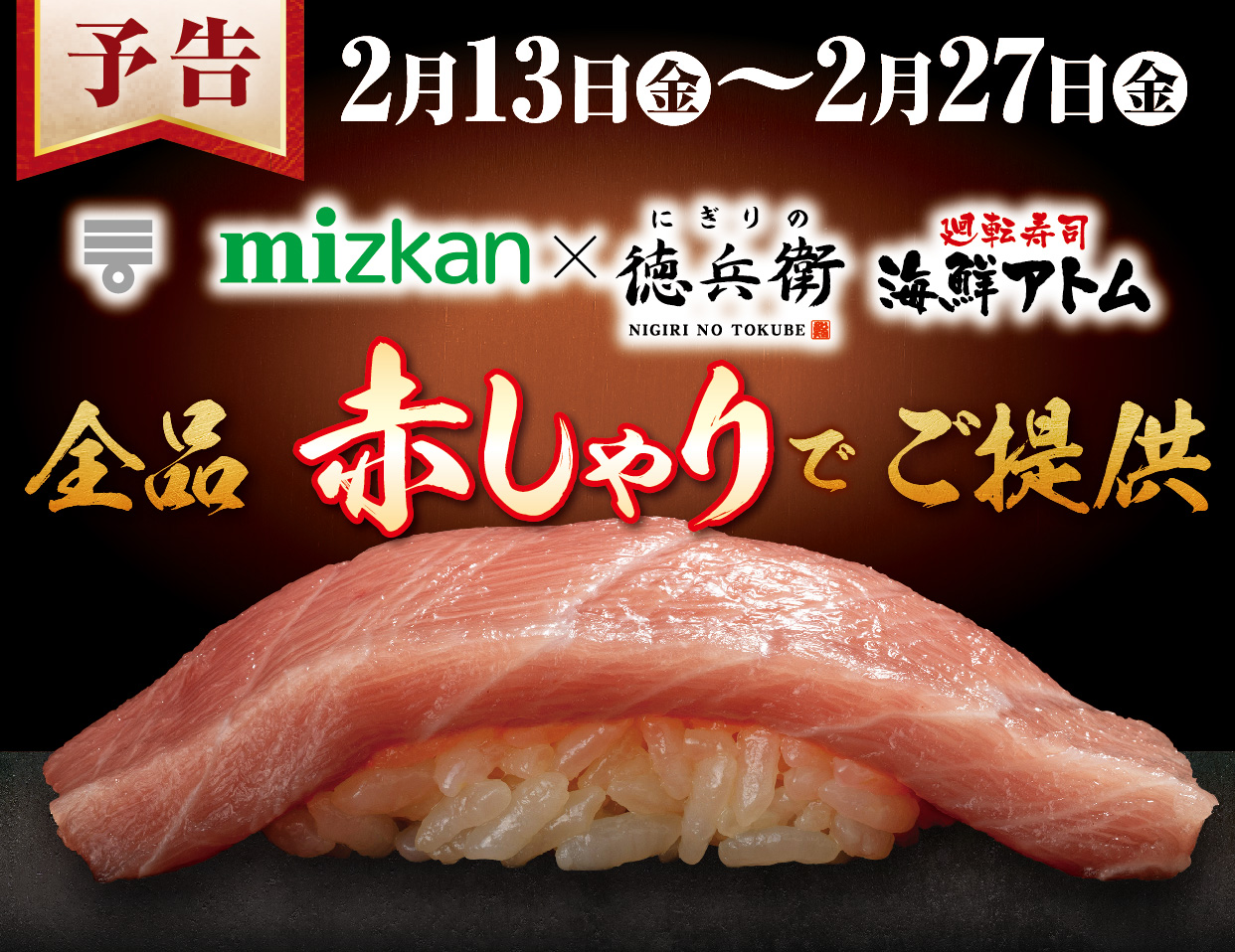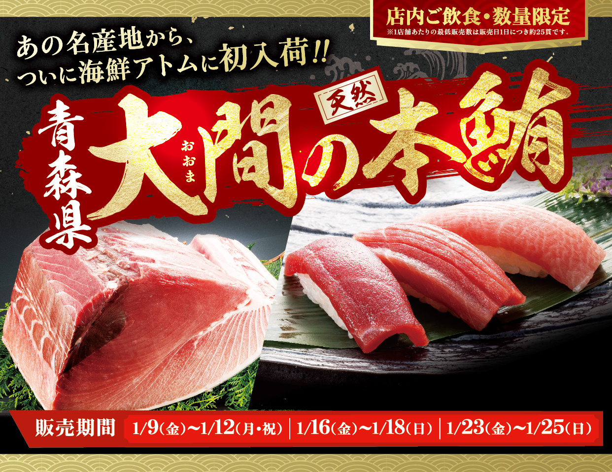 お知らせ お知らせ海鮮アトムTOP 1 / 41234 2026.01.13更新 ぶりと北海祭り2026年1月13日(火)~2月23日(月・祝) 2026.01.13更新 【日替りおみそ汁無料】冬ランチメニュー第2弾2026年1月13日(火)~2月21日(土) 2026.01.13更新 冬のスイーツ《りんご》2026年1月13日(火)~2月23日(月・祝) 2026.01.09更新 2/13(金)~27(金)は全品赤しゃりでご提供!2026年2月13日(金)~2月27日(金) 2026.01.05更新 【店内ご飲食・数量限定】大間の天然本鮪1/9~1/12・1/16~1/18・1/23~1/25 2025.12.26更新 2026年 福を呼ぶ恵方巻2026年1月26日(月)~2月3日(火) 2025.12.26更新 【㈱アトムと福井県との産業振興に関する連携協定企画】福井県内こども食堂7施設にクリスマス限・・・2026年12月26日 2025.12.02更新 2026新春福袋《ミツカン鍋セット+総額5,800円分のクーポン入り!》2026年1月3日(土)より販売開始 1 / 41234