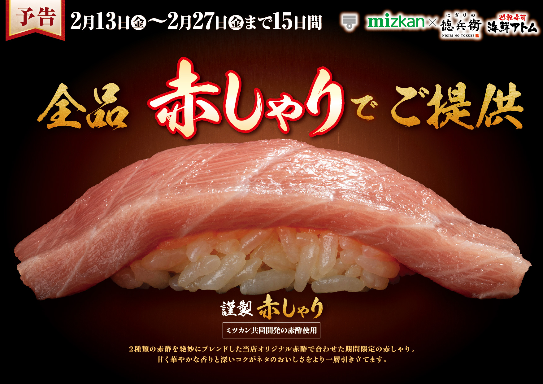 2月13日(金)~2月27日(金)までの15日間、全品「赤しゃり」にてご提供いたします。