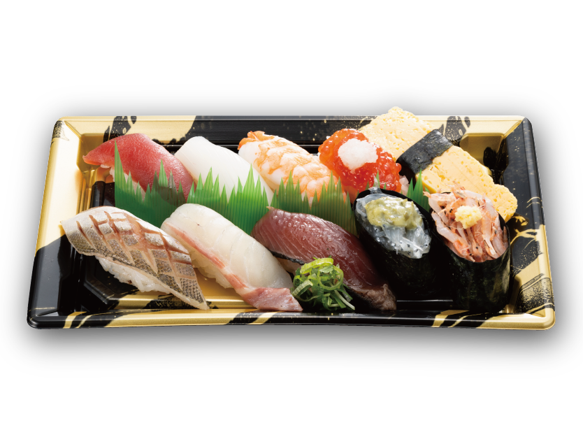 かんぱち・本まぐろ赤身・いか・数の子・赤えび・かに・うなぎ・真鯛・うにいくら・本まぐろ中とろ・飾り玉子