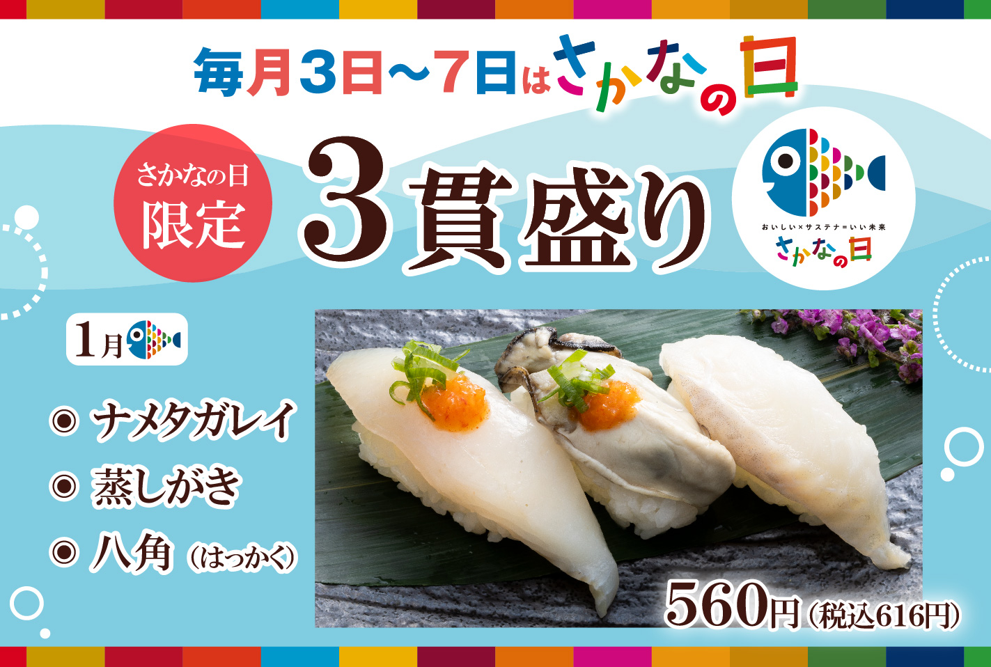 毎月3日~7日は《さかなの日》!【さかなの日限定三貫盛り】