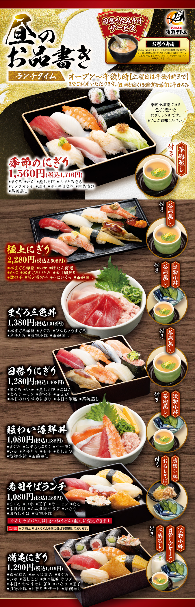 ※12月27日(土)~1月4日(日)の期間 、【ランチメニュー】 【みそ汁無料コーナー】は休止させて頂きます。
