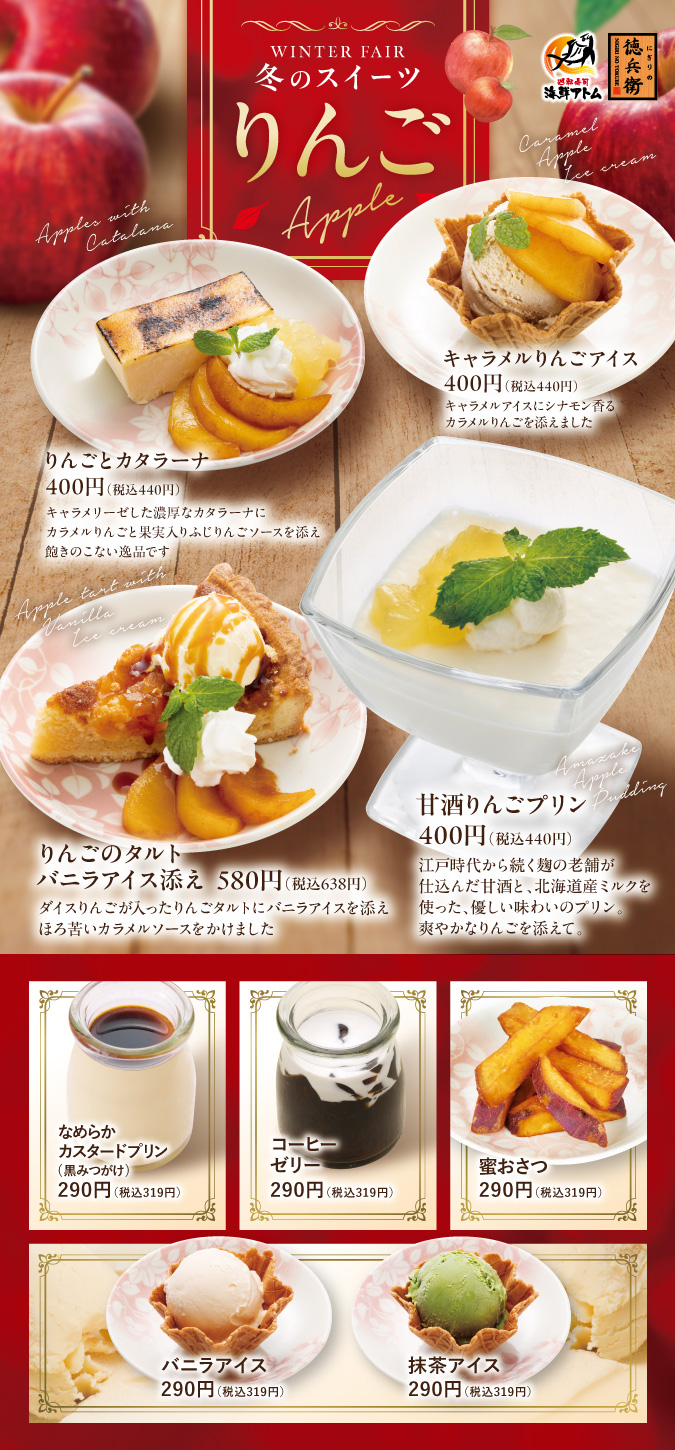 そのほかキャラメルアイスにシナモン香るりんごを添えた「キャラメルりんごアイス」、ダイスりんごたっぷりの「りんごのタルト バニラアイス添え」などをご用意しました。
