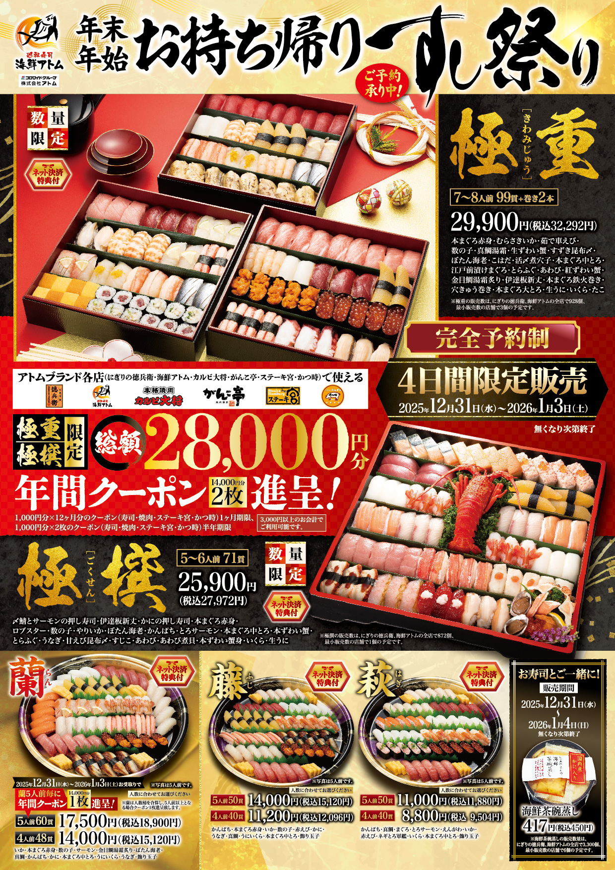 総額28,000円分年間クーポン進呈:年末年始お持ち帰りすし祭り【極重(きわみじゅう)&極撰(ごくせん)】