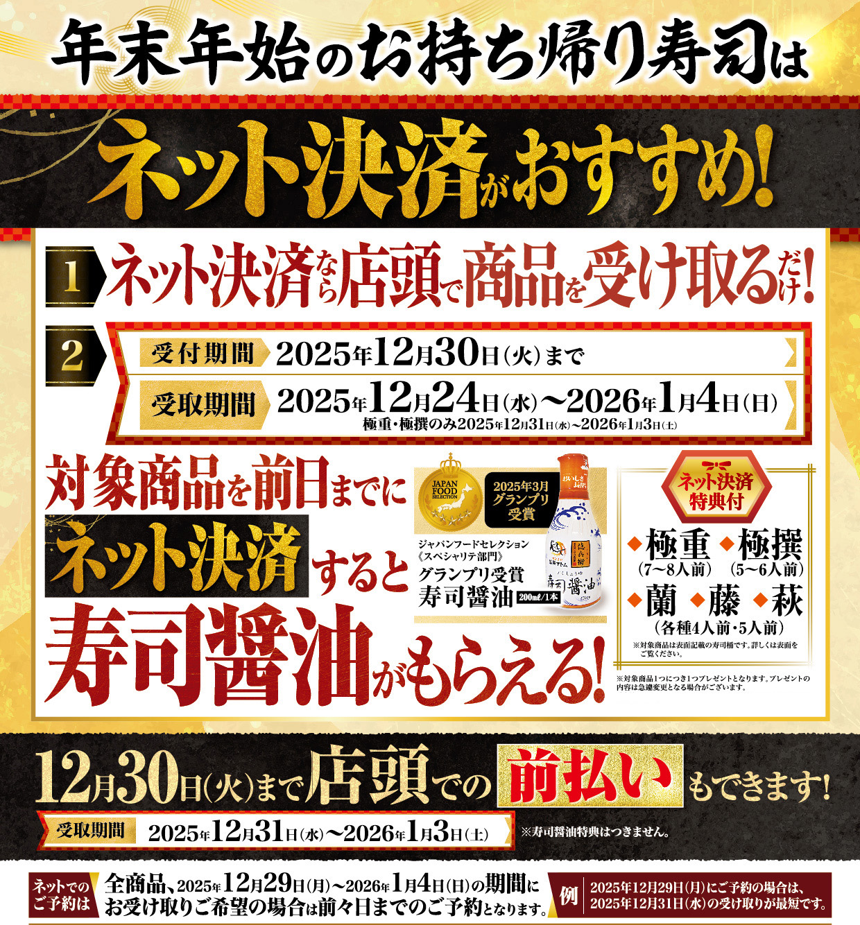 そして、12月24日(水)から1月4日(日)のお受け取り限定(極重・極撰のみ2025年12月31日(水)~2026年1月3日(土))で、対象商品を前日までにネット決済いただくと、対象商品1つにつき、ジャパン・フード・セレクション《スペシャリテ部門》グランプリ受賞の『寿司醤油』1本をプレゼント!