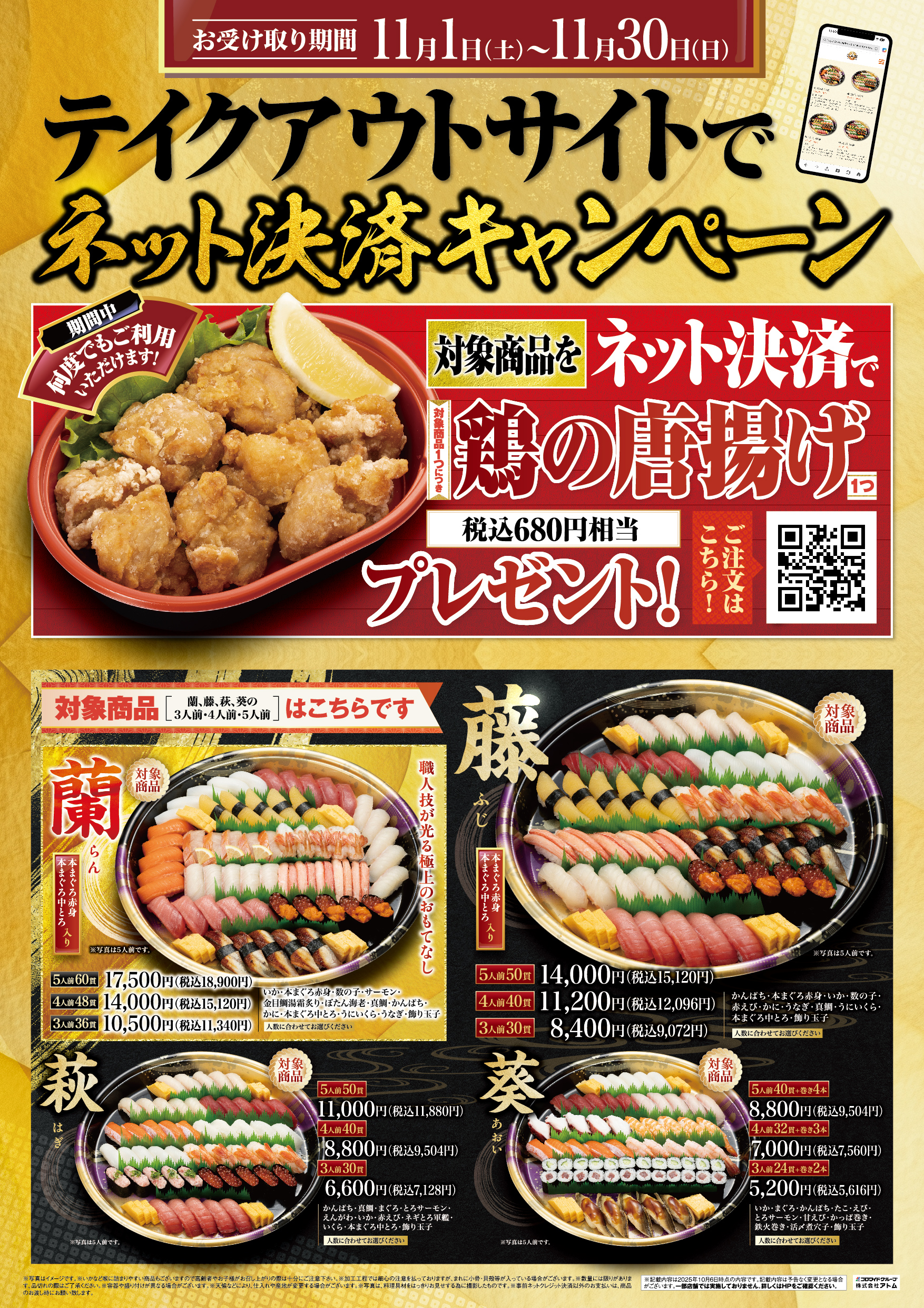 11/1(土)〜11/30(日)の期間中、セットすし桶(蘭・藤・萩・葵/3人前・4人前・5人前)をネット決済でご注文いただくと、1桶につき「鶏の唐揚げ(税込680円相当)」を1個プレゼント!期間中、何度でもご利用いただけます!