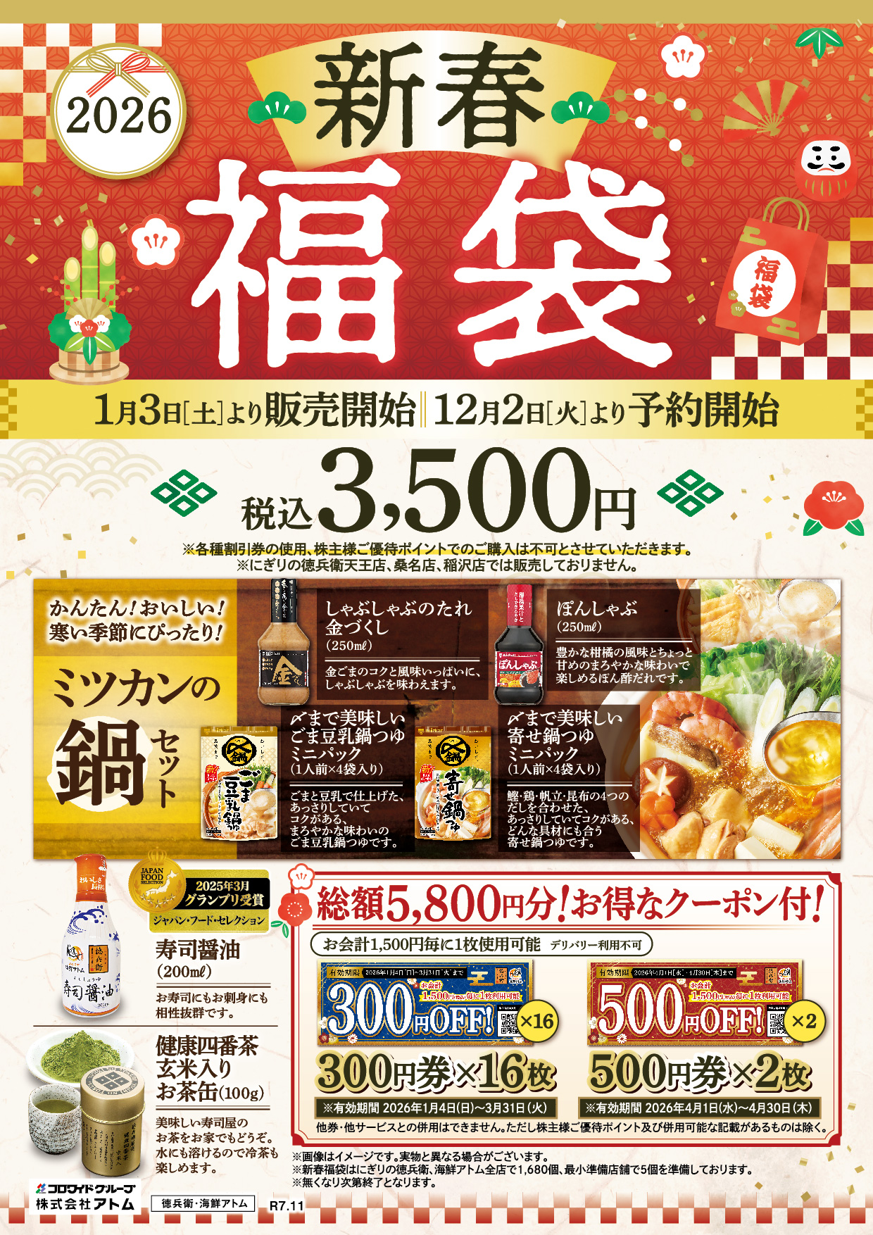 12月2日(火)より、海鮮アトム・にぎりの徳兵衛にて「2026新春福袋」予約受付開始!