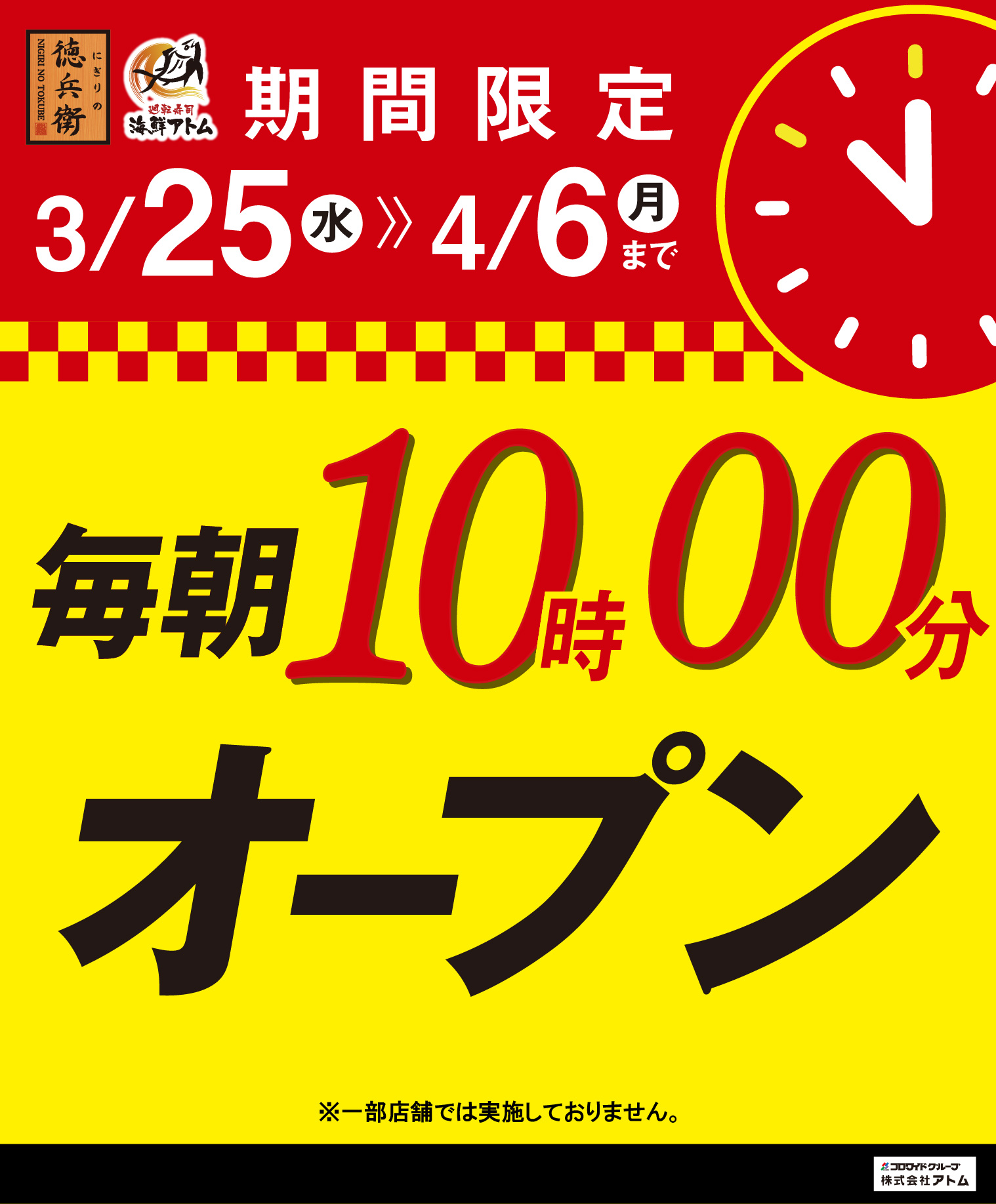 お知らせ 予告【3/25~4/6】毎朝10時00分・・・お知らせ海鮮アトムTOP 予告【3/25~4/6】毎朝10時00分オープン! 2026.02.27更新 開催期間:2026年3月25日(水)~4月6日(月) 3月25日(水)~4月6日(月)までの期間限定で、毎朝10時00分にオープンします! 比較的空いている朝の時間帯の ご利用がおすすめです! ご来店お待ちしております。 お知らせ一覧へ戻る