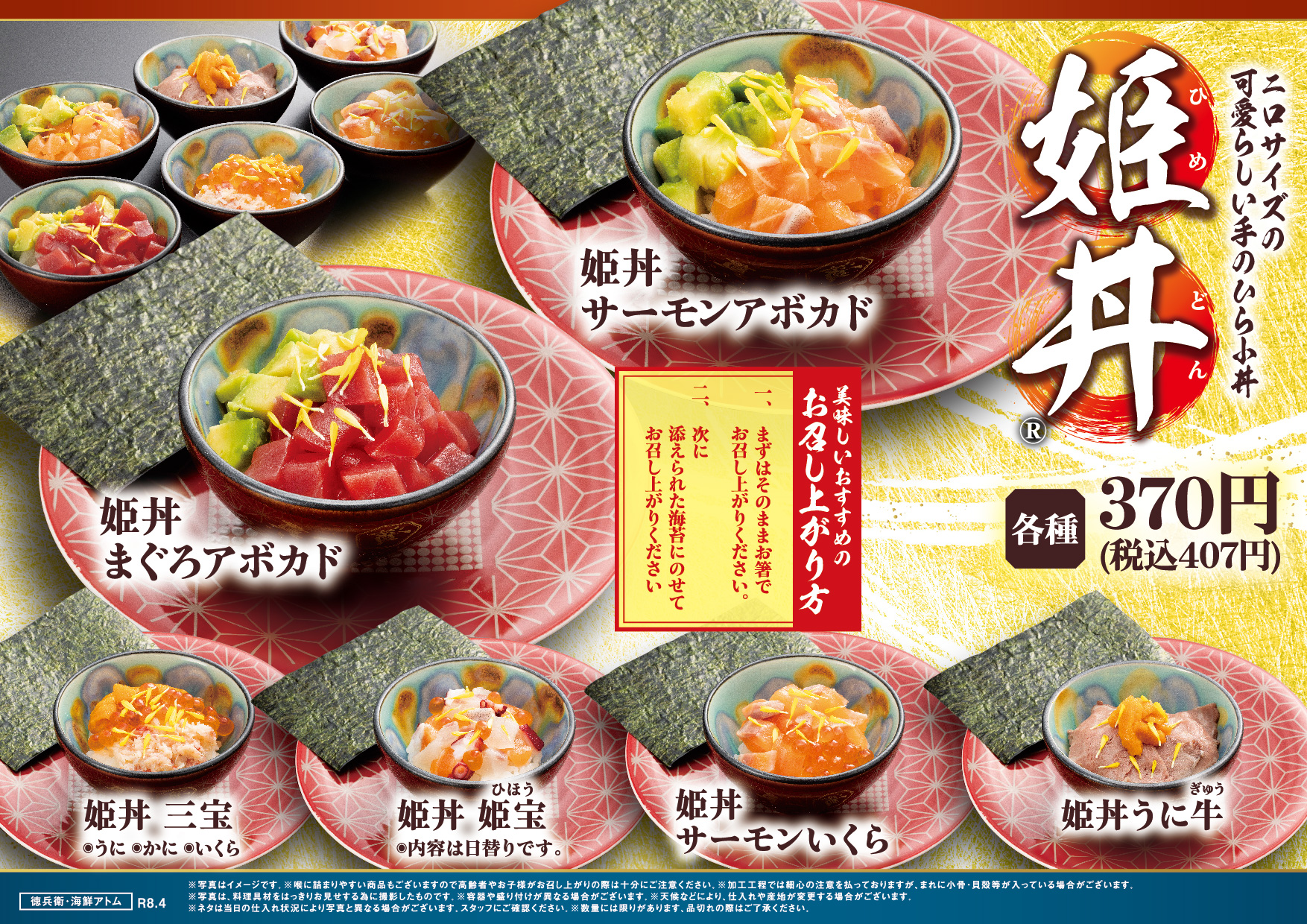●二口サイズの可愛らしい手のひら小丼「姫丼®」各370円(税込407円)