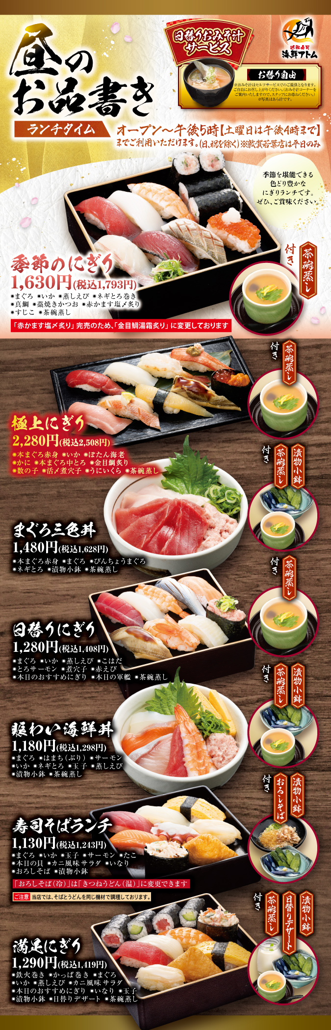 ※ランチタイムはオープンから午後5時【土曜日は午後4時まで】までご利用いただけます。(日・祝除く)※敦賀若葉店は平日のみ