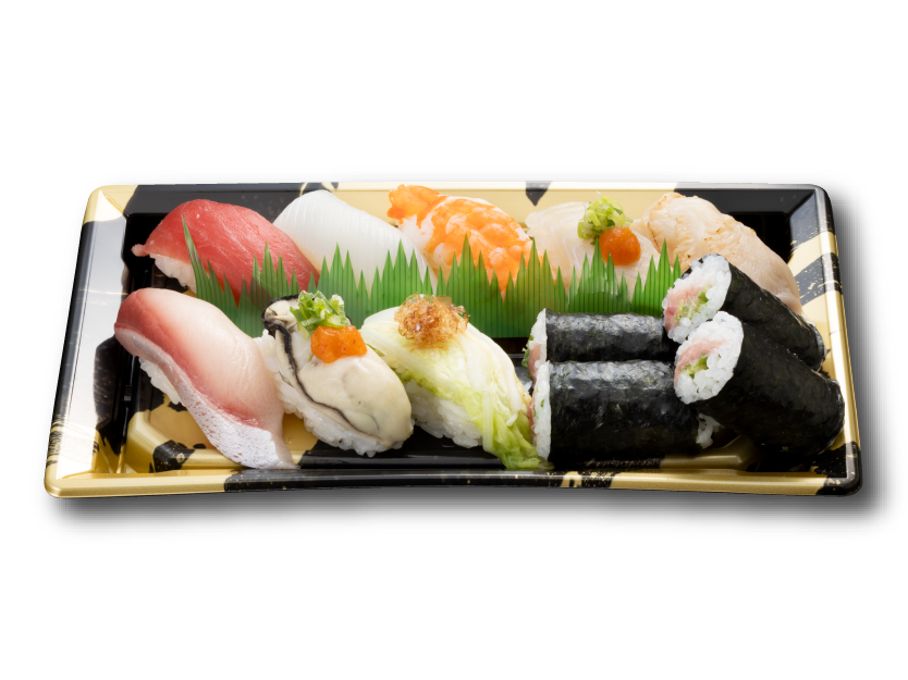 いか・まぐろ・かんぱち・たこ・えび・とろサーモン・甘えび・かっぱ巻き・鉄火巻き・活〆煮穴子・飾り玉子
