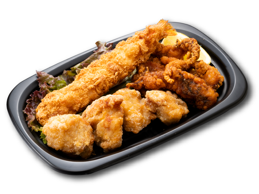 - エビフライ、げその唐揚げ、海鮮蓮根はさみ揚げ